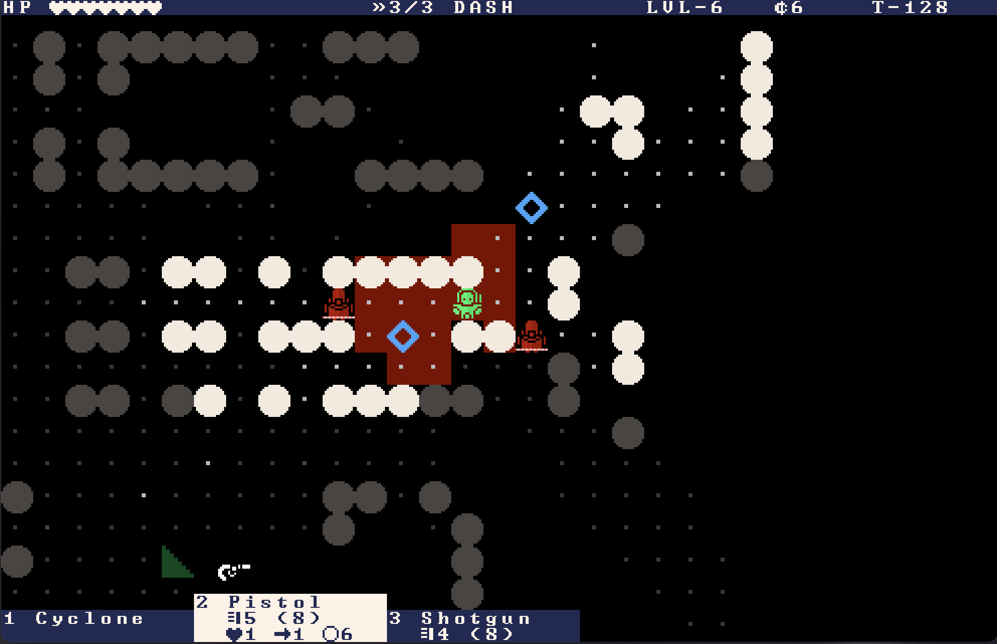 - Hold or press SHIFT to enter DASH mode. Moves are instantaneous in this state. Press (or release) SHIFT again to exit DASH. You can fire after dashing.