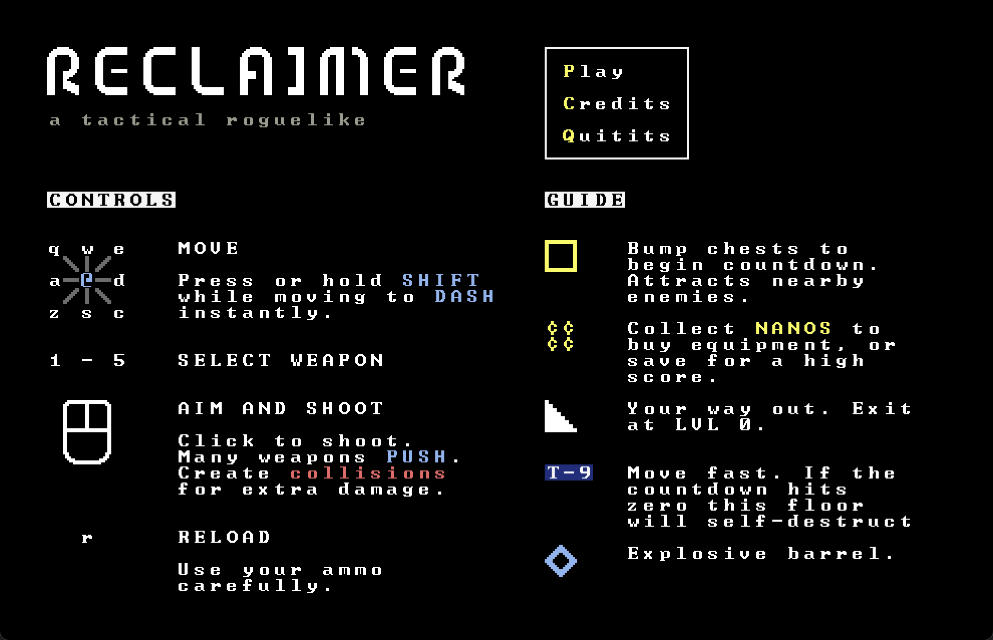 RECLAIMER is a traditional rogue-like focused on improvisational tactical combat. Use ranged and melee weapons to survive a facility filled with enemies. Conserve ammo by using the environment as your weapon. Use your dash to pause time and establish the perfect shot. Blast your way to your destination, collecting and conserving as much loot as you can on the way out.
